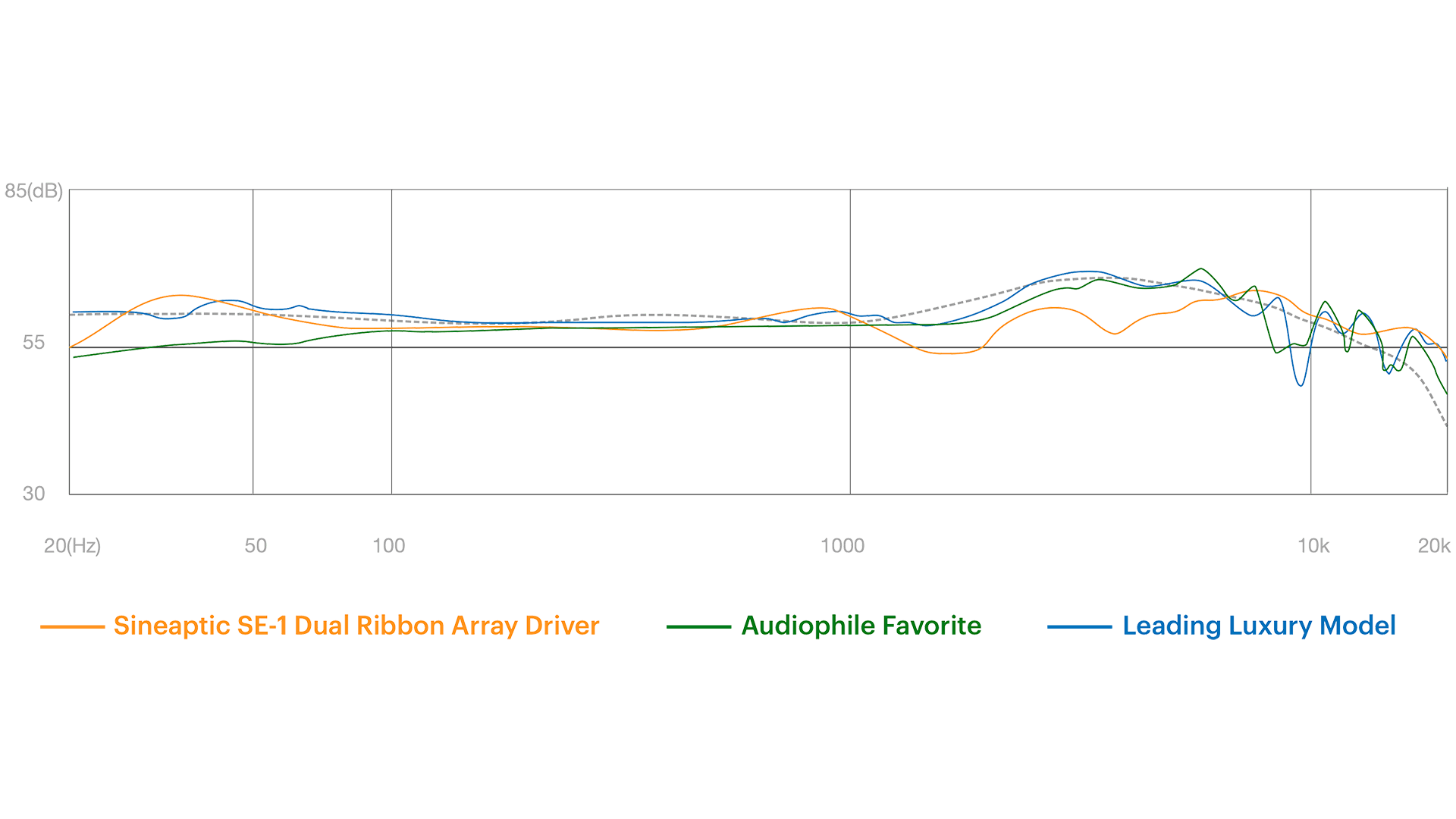 Presented above is a comparative visualization of the frequency response curves between the renowned "Audiophile Favorite" ($1,500), "Leading Luxury Model" ($50,000) and our Sineaptic SE-1 Dual Ribbon Array Driver. Despite the vast difference in price points, the curves hint at a shared commitment to neutral sound reproduction. However, it's essential to note that a frequency curve, though informative, doesn't encapsulate the entirety of an audio experience.